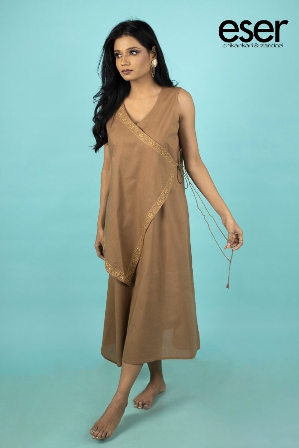 Step into understated elegance with this double-chested Angarkha, where timeless tradition meets contemporary refinement. Rendered in a warm chocolate brown hue, the silhouette is enhanced by a graceful side dori tie-up, offering both visual charm and versatile styling.