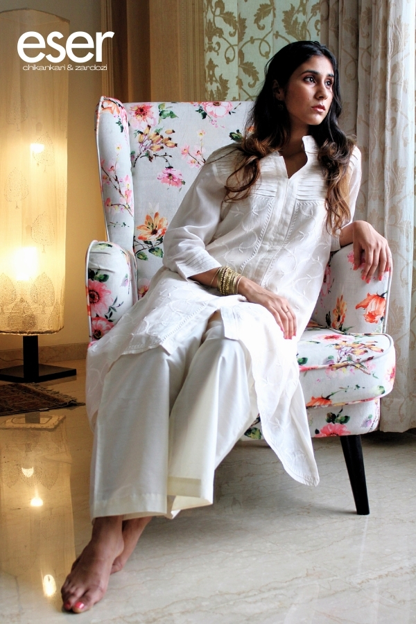 Chanderi Cream Jaal Kurta | Eser is a vision of understated sophistication, crafted to reflect quiet luxury and timeless elegance. Made from airy Chanderi silk, the kurta drapes beautifully with a soft, fluid fall that enhances its refined silhouette. The design features a contemporary asymmetrical hemline, bringing a modern edge to the classic form. Fine pin-tuck detailing on the shoulders and sleeves adds subtle structure and delicacy, while the surface is adorned with same-tone thread chikankari jaali work. This intricate embroidery creates a graceful interplay of light and texture, elevating the pristine fabric without overpowering its elegance. Paired with a matching slip for comfort and coverage, this kurta is perfect for both daytime gatherings and evening occasions. Material: Chanderi Silk | Size: Chest 38 inches, Length 38–45 inches Care Instructions: Dry clean or hand wash. Do not bleach. Shipping Information: The product will be shipped within one week of order. Shipping available within India only. Disclaimer: Colour may slightly differ due to screen settings and lighting conditions.
