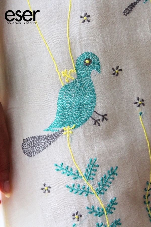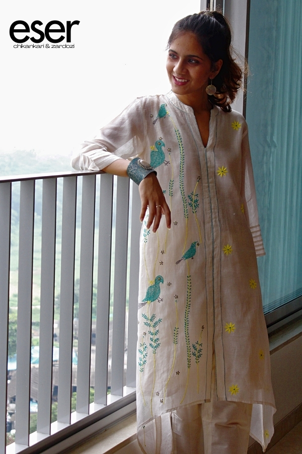 Chanderi Cream Motif Kurta | Eser blends timeless elegance with a contemporary twist, crafted in luxurious Chanderi silk that drapes beautifully with a soft, sheer finish. The graceful silhouette is designed to feel both refined and effortless, making it an ideal choice for festive and semi-formal occasions. The highlight lies in the exquisite hand-embroidered chikankari motifs, featuring delicate florals and charming bird patterns rendered in refreshing turquoise, yellow, and grey threads. This intricate detailing brings life and character to the design while maintaining an air of sophistication. A modern high-low hemline adds movement and structure, while delicate pin-tuck detailing on the sleeves enhances the contemporary appeal. Paired with a matching slip for comfort and coverage, this kurta beautifully balances traditional craftsmanship with modern style. Material: Chanderi Silk | Size: Chest 36 inches, Length 38–45 inches Alteration possible to a smaller size Care Instructions: Dry clean only. Do not bleach. Shipping Information: The product will be shipped within one week of order. Shipping available within India only. Disclaimer: Colour may slightly differ due to screen settings and lighting conditions.