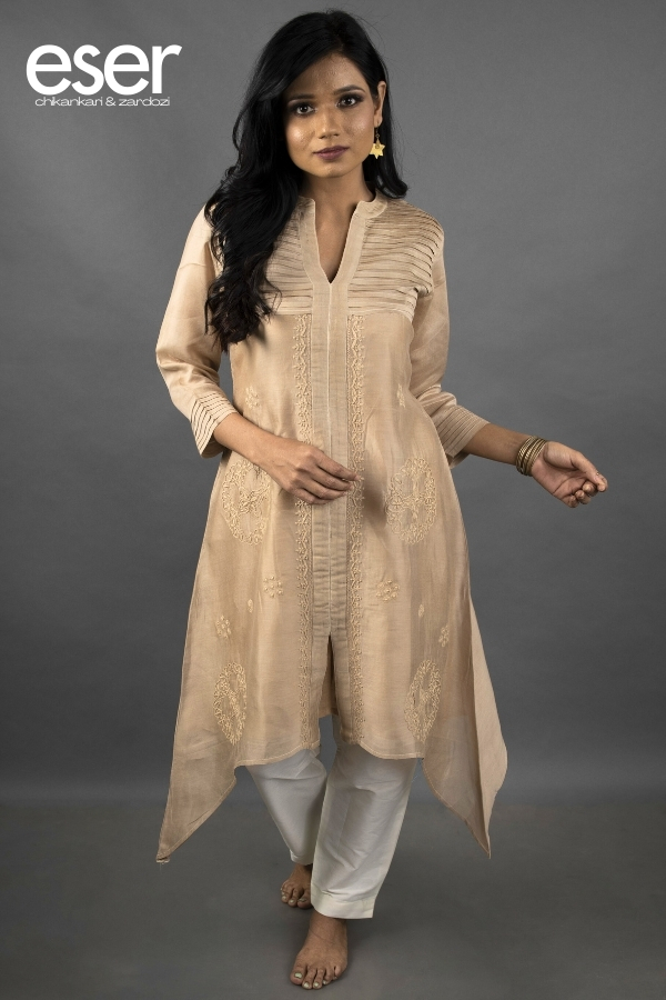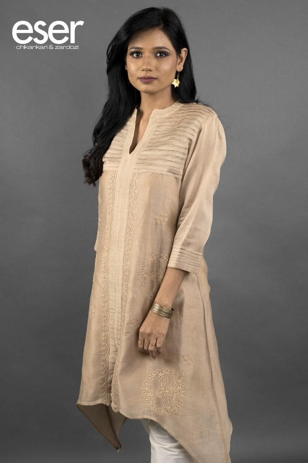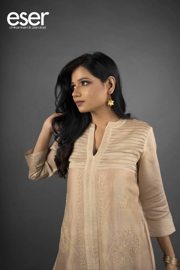 Chanderi Domino Brown Kurta | Eser is an epitome of understated elegance, crafted from luxurious Chanderi silk that carries a subtle sheen and graceful drape. The silhouette blends traditional craftsmanship with refined modern detailing, making it a timeless addition to any wardrobe. The front is adorned with delicate hand-stitched chikankari embroidery, celebrating the charm of heritage artistry. Fine pin-tuck detailing on the shoulders, neckline, and sleeves enhances the structure of the kurta, lending a contemporary touch to its classic form. Designed to drape beautifully, the kurta comes with a soft cotton slip for added comfort and ease of styling. Versatile and sophisticated, it pairs effortlessly with straight pants, churidar, or palazzos, making it suitable for both daytime elegance and evening gatherings. Material: Chanderi Silk | Size: Chest 36 inches, Length 38–47 inches Alteration possible to a smaller size Care Instructions: Dry clean, hand wash with similar light-coloured garments. Do not bleach. Shipping Information: The product will be shipped within one week of order. Shipping available within India only. Disclaimer: Colour may slightly differ due to screen settings and lighting conditions.