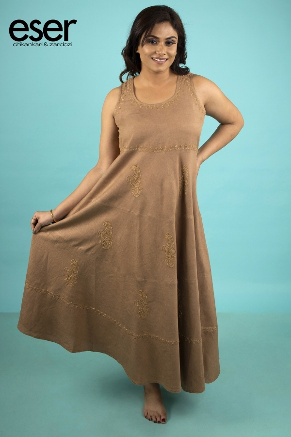 Potters Clay Umbrella Dress | Eser is a charming expression of effortless elegance, blending artisanal detail with a graceful flowing silhouette. Crafted from soft modal flex fabric, the dress offers breathability and comfort while maintaining a beautiful, fluid drape. The sleeveless design features an alluring round neckline where delicate chikankari hand embroidery subtly frames the yoke, lending refined handcrafted detail. Scattered paisley motifs cascade gracefully along the flared base, adding depth and visual movement to the design. Enhanced with tiered detailing, the silhouette flows freely with every step, making it ideal for warm, breezy days. The ankle-length cut completes the look with a flattering umbrella-like fall that balances casual comfort with timeless elegance. Material: Modal Flex | Size: Chest 40 inches, Length 50 inches Care Instructions: Dry clean, hand wash or machine wash with similar light-coloured garments. Do not bleach. Shipping Information: The product will be shipped within one week of order. Shipping available within India only. Disclaimer: Colour may slightly differ due to screen settings and lighting conditions. The slip does not accompany the dress, unless specifically mentioned in the respective description.
