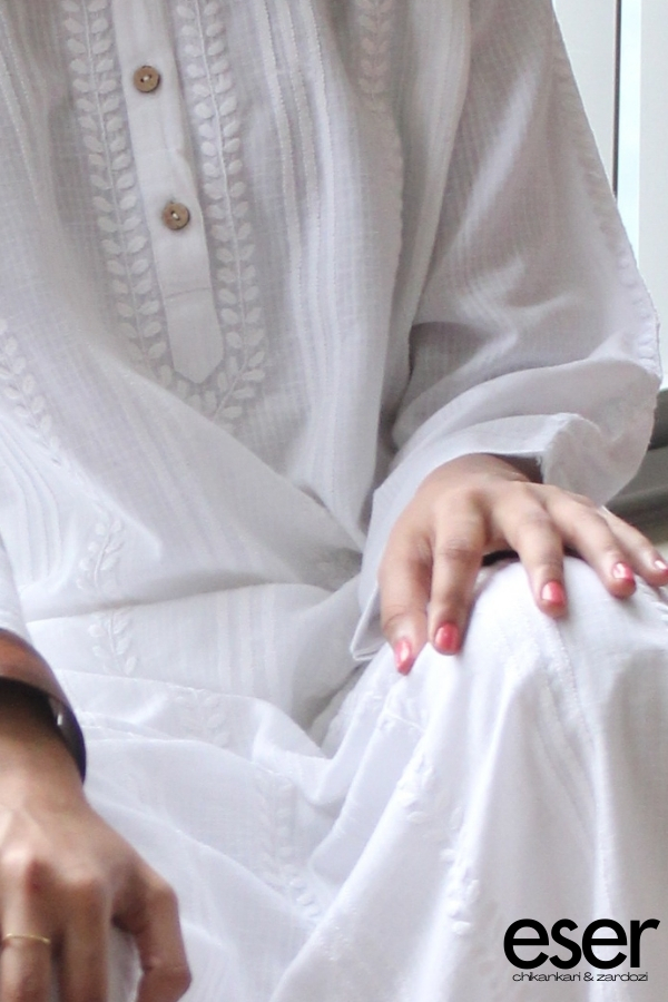 The design is refined with delicate chikankari bail embroidery along the neckline, sleeve edges, and side panels—intricate yet understated, enhancing the kurta’s timeless appeal. Its versatile length and minimalist lines make it ideal for everyday refinement as well as understated occasion wear.