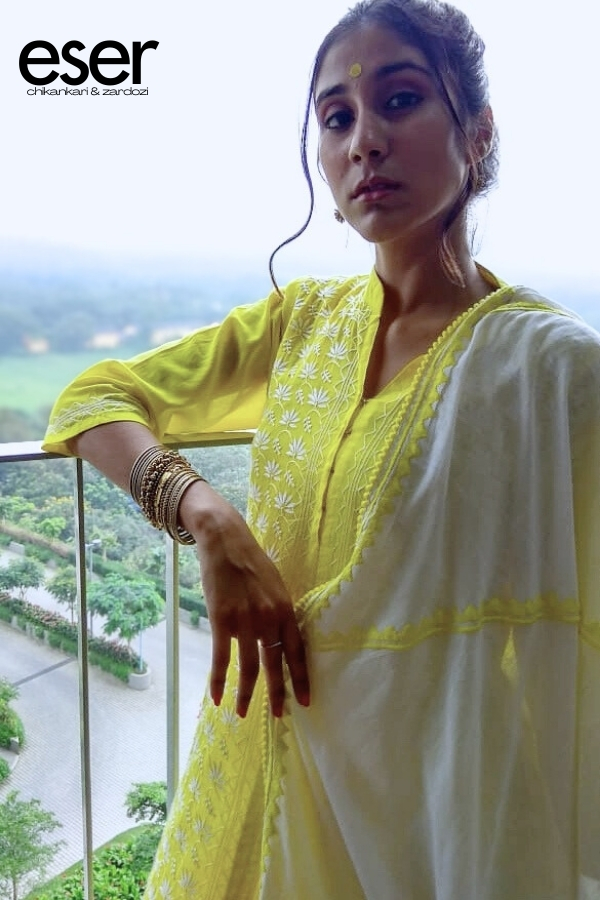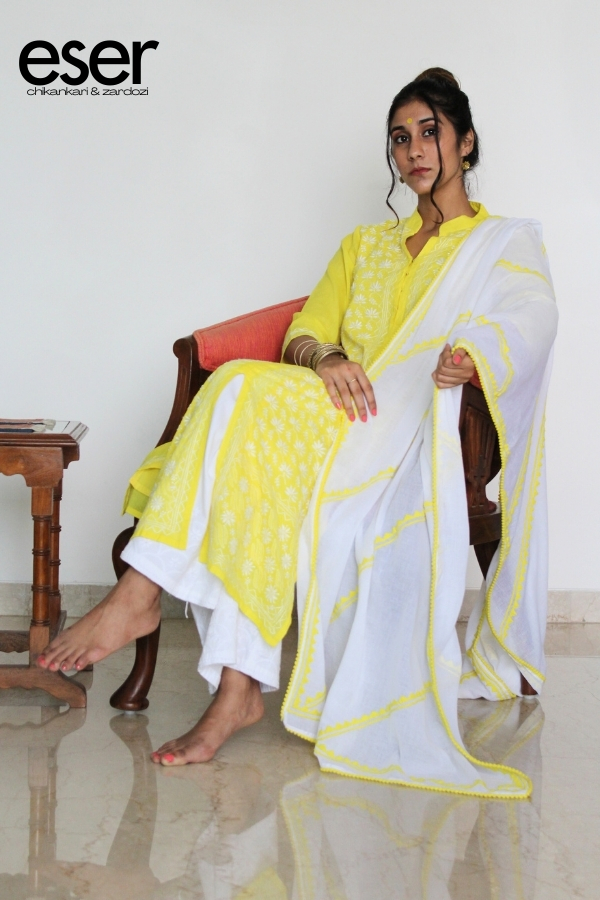 Yellow Long Kurta | Eser brings together brightness and timeless craftsmanship in a breezy summer silhouette. Crafted from lightweight malmal cotton in a vibrant yellow hue, the kurta drapes effortlessly while keeping you cool and comfortable. Intricate white chikankari hand embroidery adorns the fabric, lending delicate texture and artisanal elegance to the design. The long, flowing silhouette enhances its graceful movement, making it perfect for summer festivities as well as relaxed gatherings. Paired with a white dupatta featuring yellow Java embroidered borders, the ensemble creates a fresh and refined look that celebrates traditional craft with effortless style. Material: Malmal Cotton | Size: Chest 38 inches, Length 45 inches Care Instructions: Dry clean, hand wash or machine wash with similar coloured garments. Shipping Information: The product will be shipped within one week of order. Shipping available within India only. Disclaimer: Colour may slightly differ due to screen settings and lighting conditions. The slip does not accompany the dress, unless specifically mentioned in the respective description.
