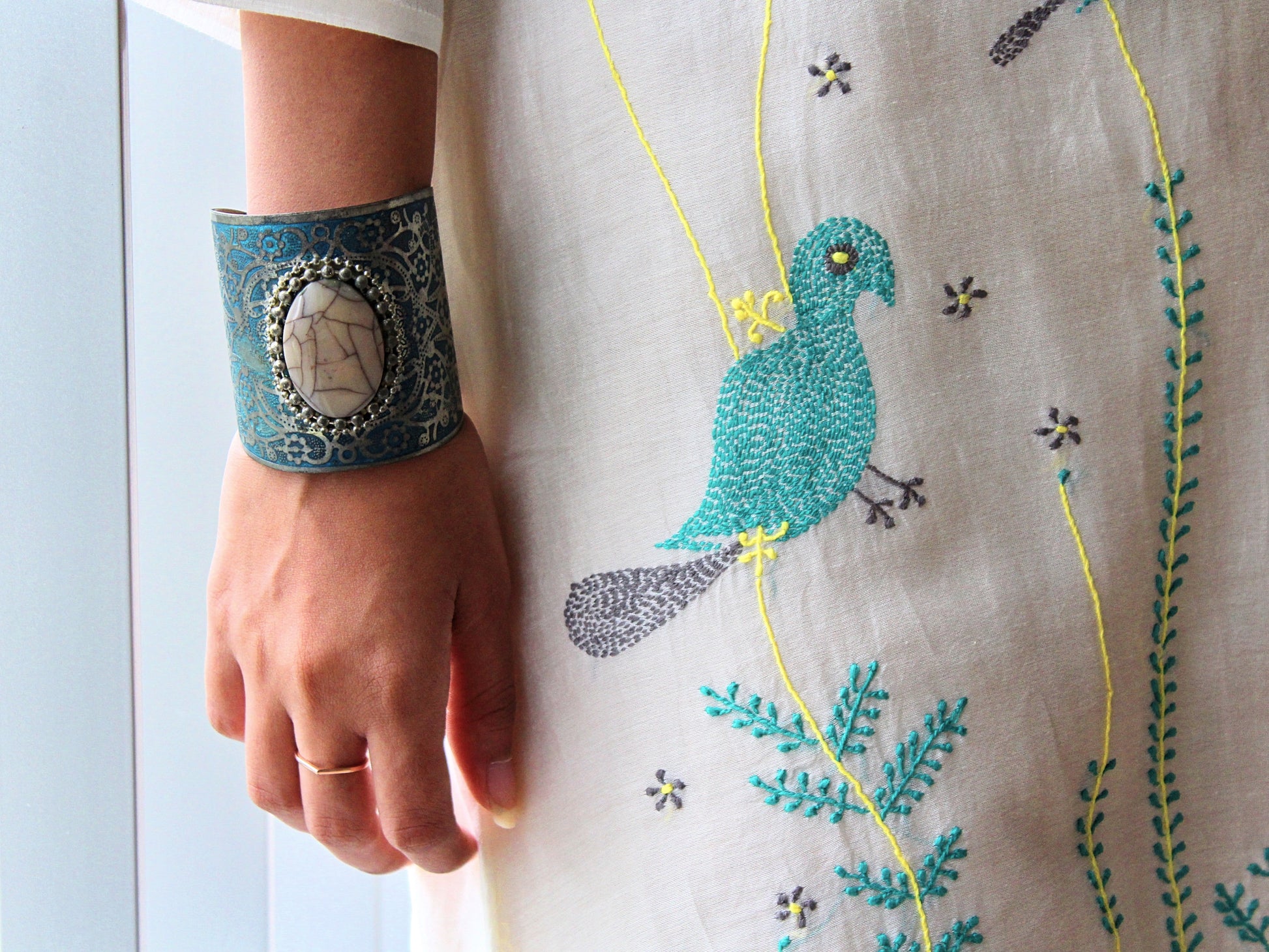 This is an elegant Chanderi silk kurta featuring a contemporary twist on classic chikankari motifs. The hand embroidery showcases exclusive, intricate work — delicate florals and charming bird motifs in refreshing turquoise, yellow, and grey threads, creating a lively yet graceful design. The high-low hemline and the delicate pin-tuck detailing on the sleeves adds a modern silhouette, while the soft sheer fabric drapes beautifully over the body. It comes with a matching slip for comfort and coverage, making it perfect for both festive and semi-formal occasions.