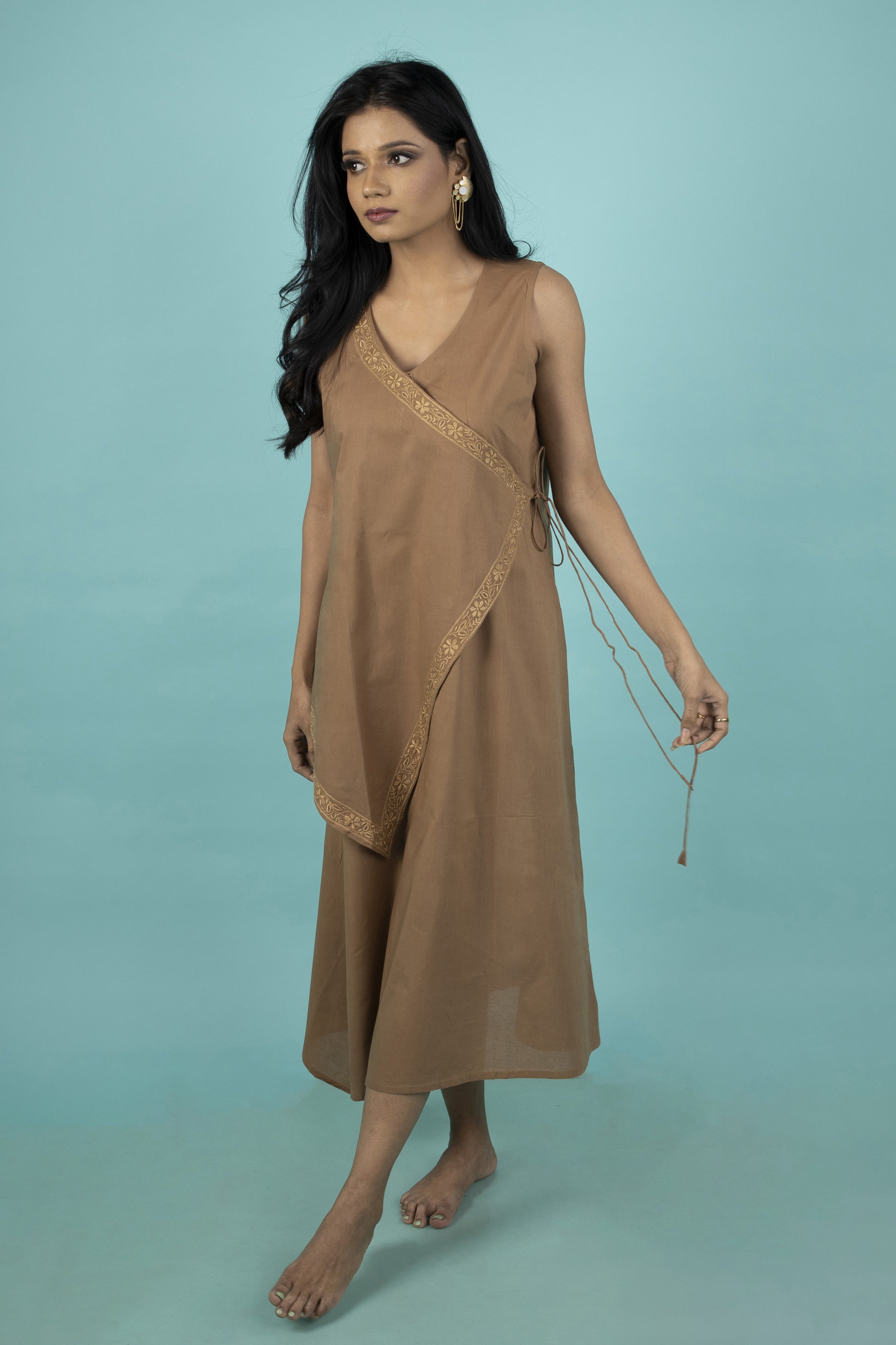 Step into understated elegance with this double-chested Angarkha, a perfect blend of tradition and contemporary style. Designed in a warm chocolate brown hue, it features a graceful side dori tie-up that adds charm and versatility to the silhouette.The edges are adorned with an exquisitely hand-stitched chikankari border, lending it timeless artistry and refinement. Whether worn to the office for a polished day look or styled for special evenings, this Angarkha makes a statement of effortless sophistication.