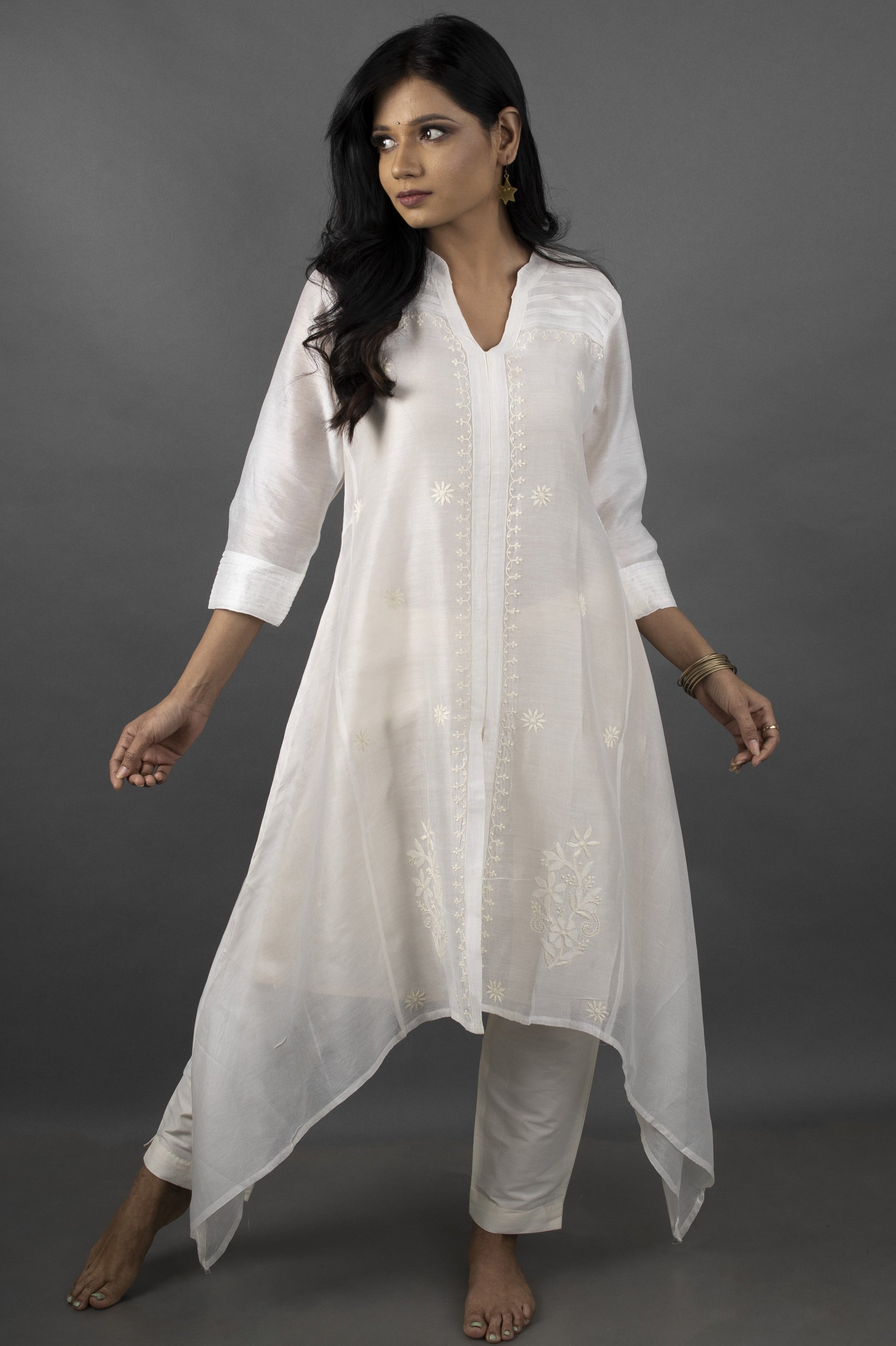 This off-white kurta is crafted from luxurious Chanderi silk, exuding elegance with its subtle sheen and fluid drape. The front is adorned with exquisite hand-stitched chikankari embroidery, adding delicate artistry to the silhouette. Designed with an asymmetric hemline, it features a band-collar slit neckline that frames the look beautifully, while pintucks on the shoulders and sleeves bring refined detailing.
