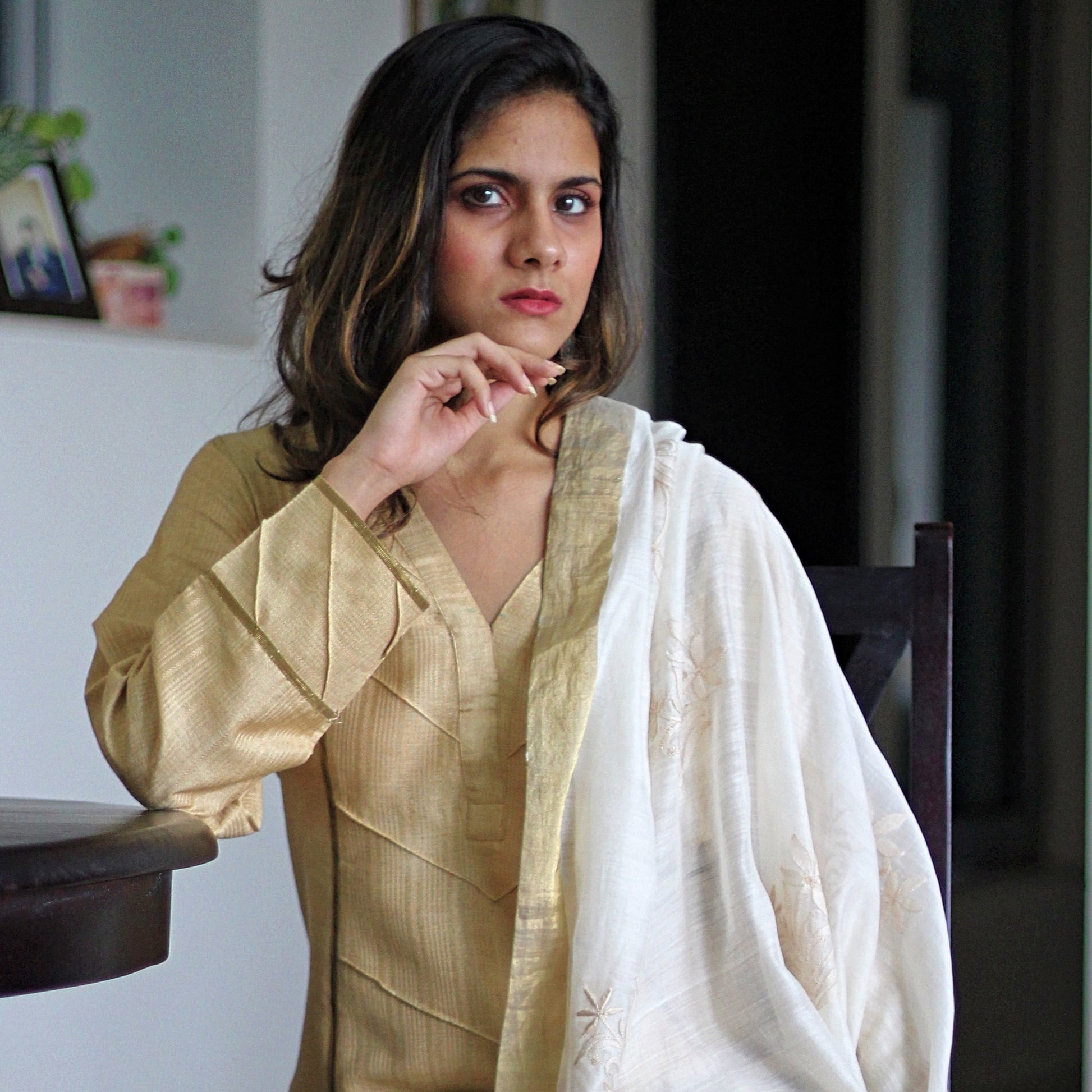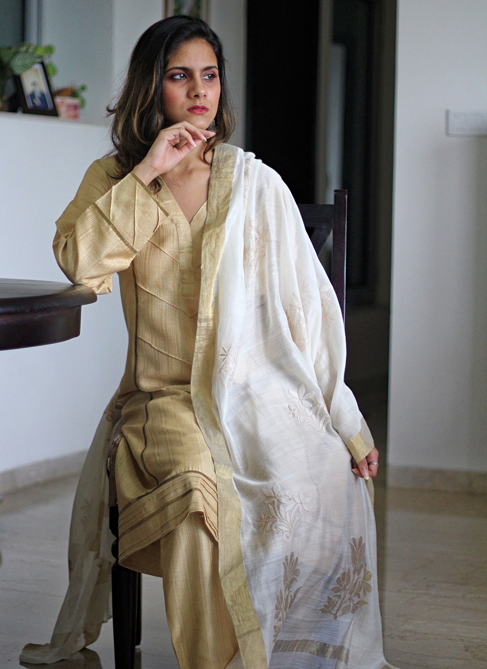 The highlight is the chanderi silk dupatta, airy and light in pristine ivory, edged with a soft gold zari border. It’s embellished with fine floral chikankari embroidery, lending a touch of artisanal charm to the ensemble. The play of tussar’s matte sheen with chanderi’s gossamer translucence creates a timeless, heirloom-worthy pairing.