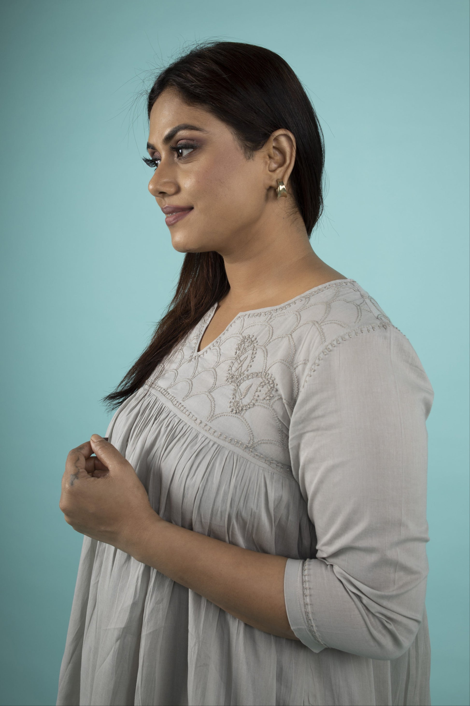 This dress is a graceful blend of comfort and artistry. Crafted in a soothing summer hue, it features a delicate V-neckline and three-quarter sleeves, finished with fine detailing for an understated charm. The highlight lies in the beautiful hand-embroidered chikankari jaal on the yoke at the front and back, intricately worked to create a light, airy texture that makes it a perfect choice for peak summer days. The soft gathers cascading from the yoke lend it an effortless flow, ensuring both ease and elegance. Pair this dress with dainty silver or pearl jewellery and flat kolhapuris or strappy sandals for a chic day-out look.