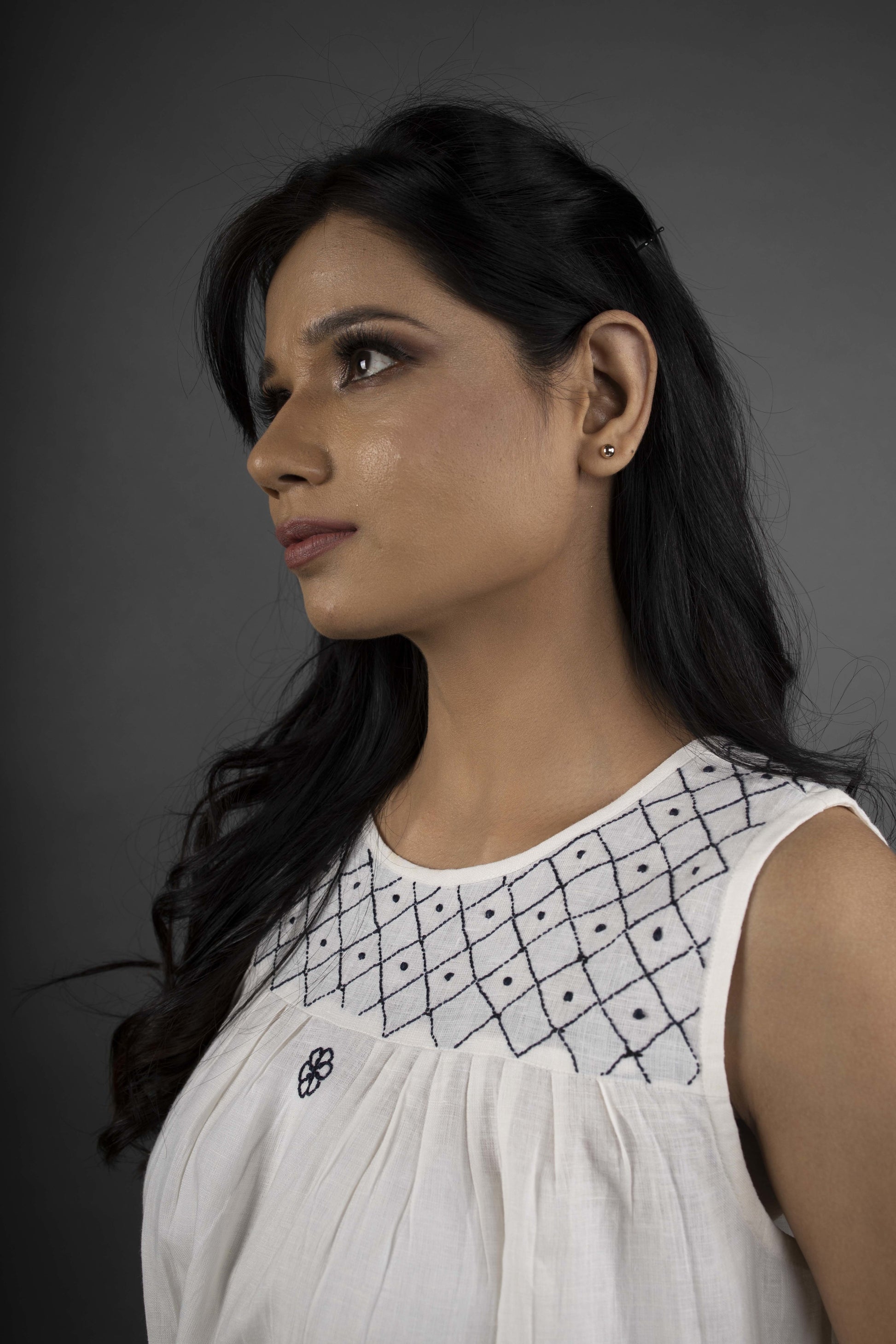 Ethereal in its simplicity, this linen dress captures the poetry of understated elegance. The yoke is adorned with hand-embroidered chikankari, where diamond-shaped jaal and dainty motifs bloom in deep blue threads—like whispers of artistry against a canvas of pure white. Its graceful round neckline and sleeveless silhouette exude effortless charm, while the fluid drape moves with quiet sophistication. A piece that flows seamlessly from sunlit hours to starlit evenings, it embodies modern refinement with a timeless soul.