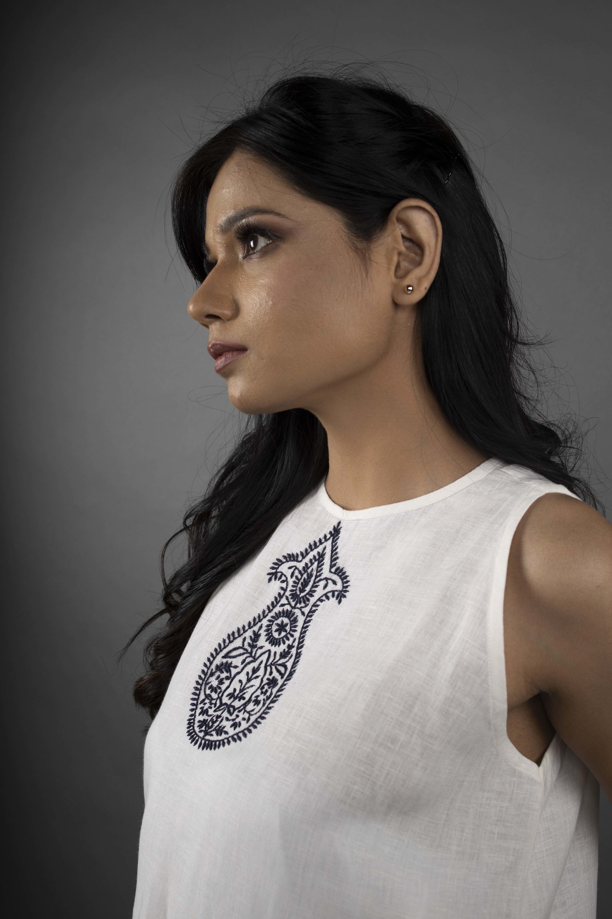 Effortless and striking, this linen dress blends modern charm with timeless craftsmanship. The sleeveless silhouette with a classic round neckline becomes a canvas for intricate hand-embroidered chikankari bootis, delicately rendered in deep blue threads. Each motif is a testament to artistry, lending the dress an air of elegance and individuality. A piece that celebrates both grace and confidence, it transforms everyday dressing into something truly exquisite.