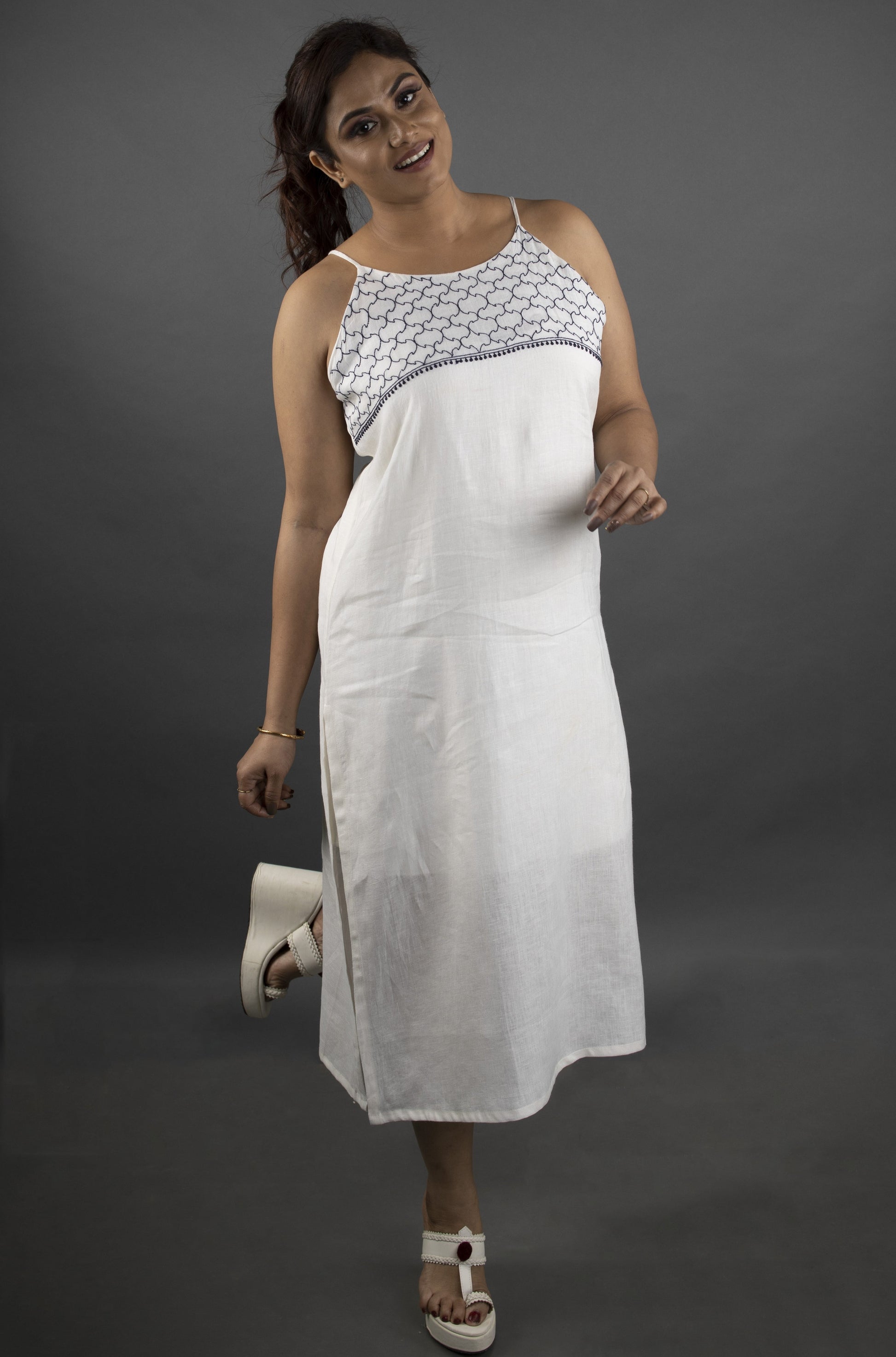 A whisper of elegance, this linen spaghetti dress drapes with airy grace, perfect for both casual gatherings and semi-formal evenings. Its front yoke blooms with an intricate jaal of hand-embroidered chikankari, delicately woven in deep blue threads that echo timeless artistry. Modern in cut yet rooted in tradition, it strikes a balance between simplicity and sophistication an effortless canvas of everyday luxury.