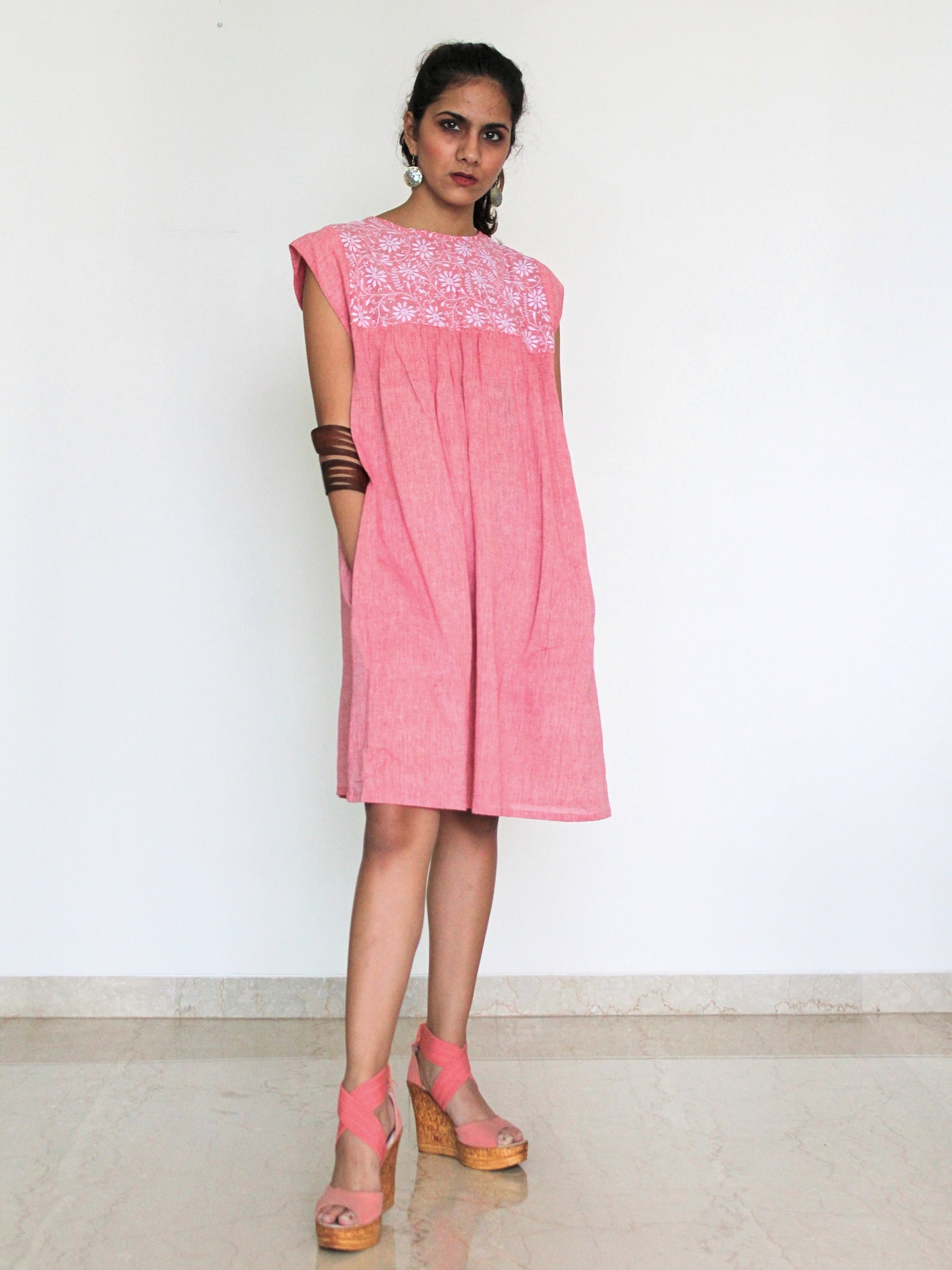 This dress is crafted from breathable Mangalgiri cotton, known for its fine weave and soft texture, making it ideal for warm weather. The yoke features intricate white chikankari hand embroidery in floral motifs, adding a touch of artisanal elegance to its relaxed, sleeveless A-line silhouette. Side pockets enhance its comfort and practicality, while the knee-length cut keeps it playful yet sophisticated. It is a loose fit dress and can fit from chest size 36 inches to 42 inches.