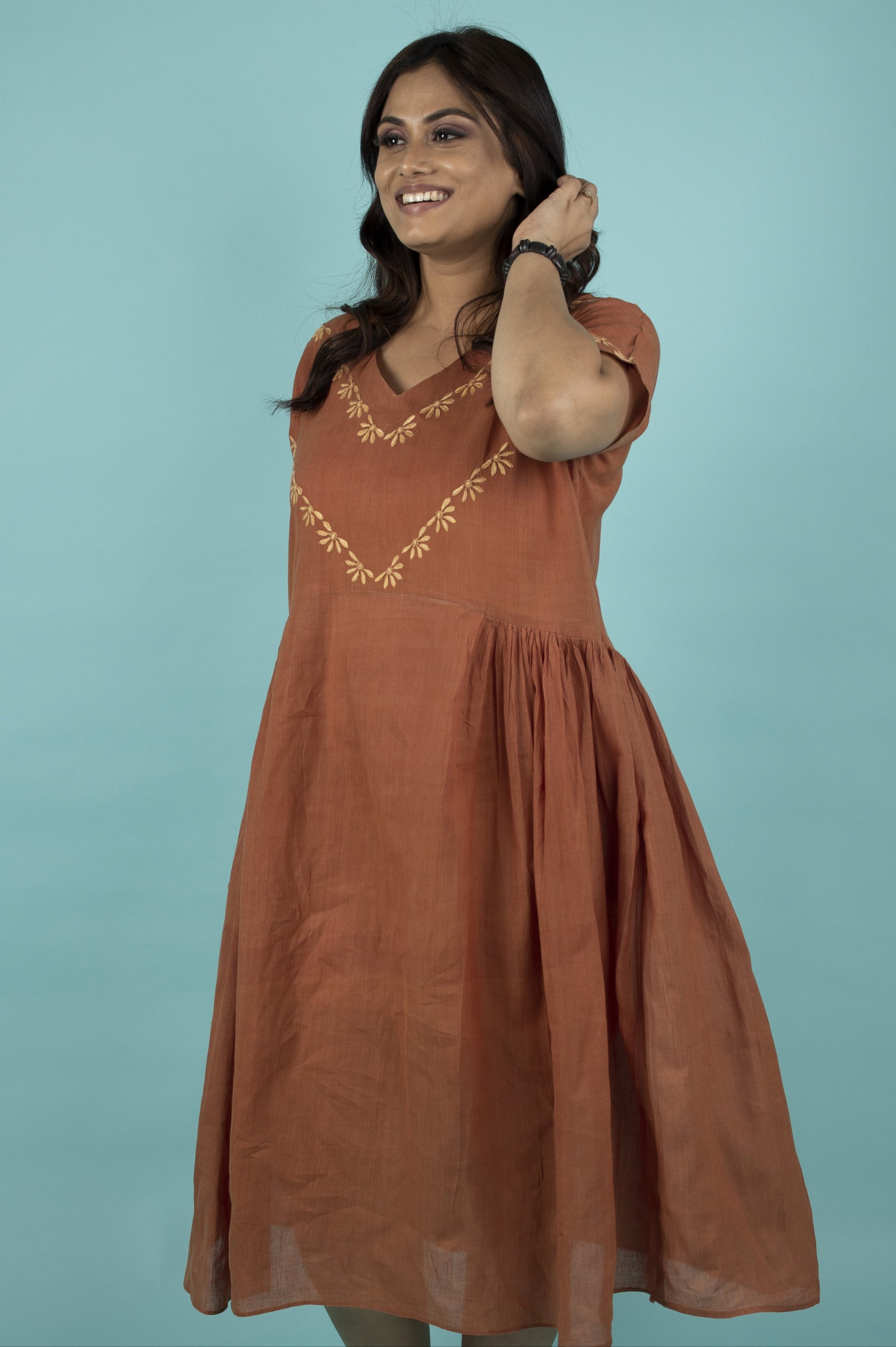 Crafted from breathable pure cotton, this dress is designed to keep you cool and stylish in the summer heat. The highlight is the hand-embroidered chikankari motifs, artfully arranged in a V-shaped placement that begins at the neckline and flows seamlessly onto the sleeves. This thoughtful detailing not only frames the neckline beautifully but also adds a touch of elegance to the sleeves. The gathered sides enhance movement and create a relaxed yet flattering silhouette. Keep it minimal with dainty silver jewelry and kolhapuri sandals for daytime elegance, or pair with block heels and a statement bangle for an elevated casual look.