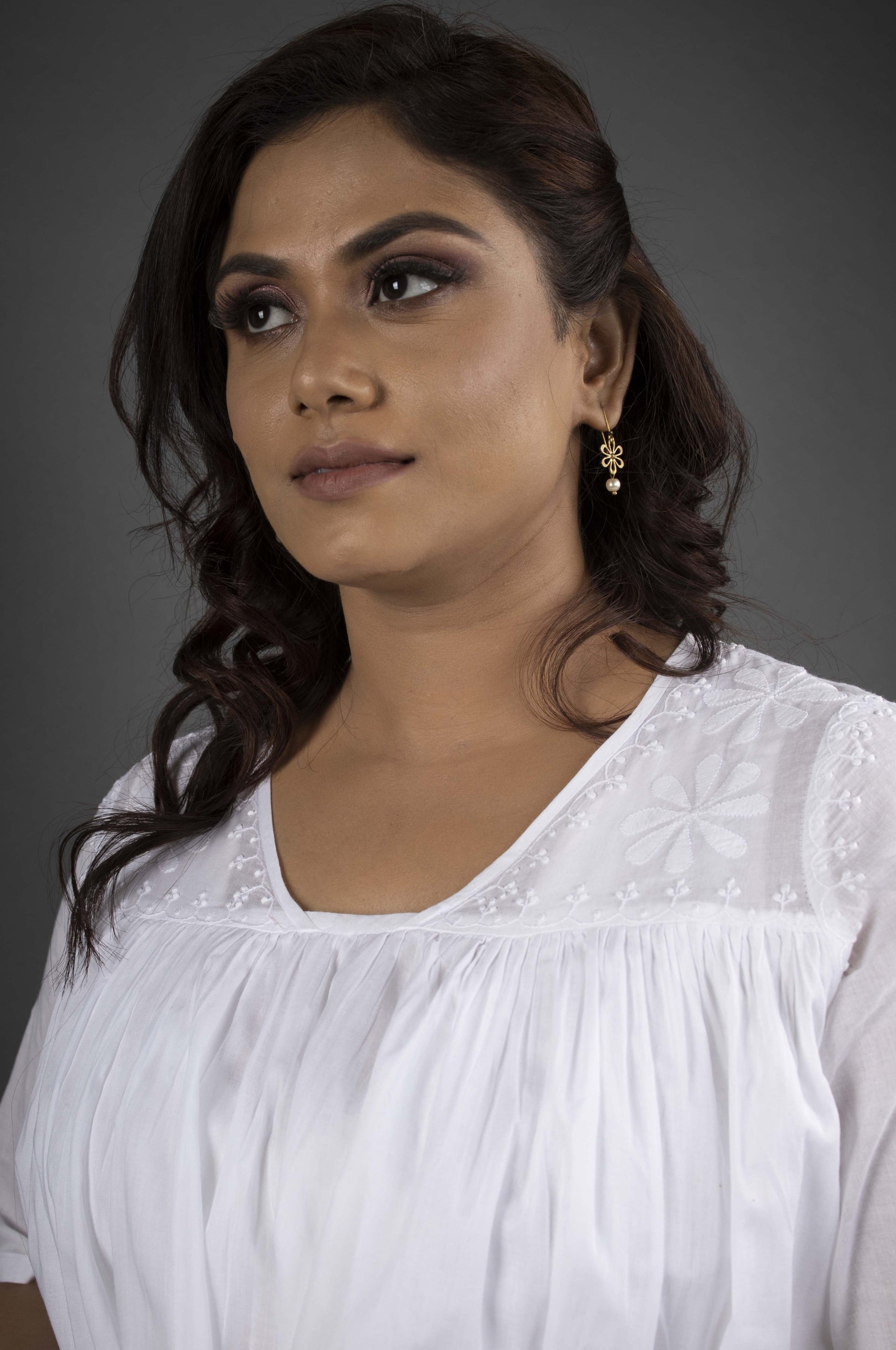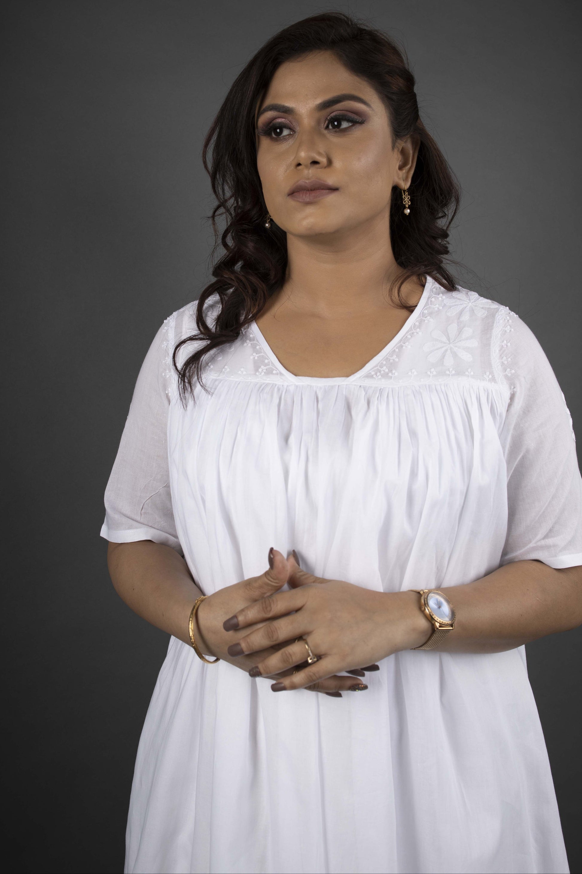 Crafted in the softest malmal fabric with a stitched lining, this flowing dress is the essence of comfort and understated elegance. Designed with half sleeves and a gently gathered silhouette, it offers effortless ease in every movement. The highlight lies in the chikankari embroidery delicately handworked on the yoke, adding a touch of timeless artistry to its simple charm. A versatile piece that feels as graceful for relaxed days as it does for intimate evenings.